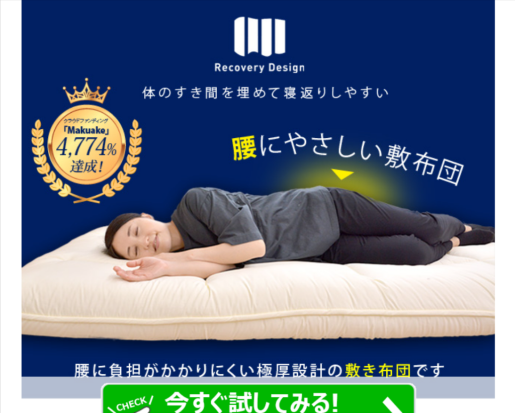 (PR)Recovery Design(リカバリーデザイン)敷布団 ★☆敷布団の通販サイトのご紹介です!★☆◆おすすめポイント◆クラウドファンディング4,774%達成した腰のことを考えた、極厚で寝返りしやすい敷布団のようです。腰を大切にしたい方へ、より良い睡眠環境をとの思いで昭和36年創業、布団一筋のふとん屋が、腰のことを考えた敷布団を作られたそうです。●特徴●・よりよい睡眠環境を実現するために、体のすき間を埋めて寝返りのうちやすい構造のようです。・腰に負担がかかりにくい極厚設計の敷き布団だそうです。・素材の特性を活かした7層のレイヤー構造で体圧分散と高反発ハイブリッド構造、表面は優れた体圧分散性能がありながら、内側で高反発性を兼ね備えているのが敷布団の特徴とのことです。・清潔な中綿、抗菌防臭、吸汗速乾の機能素材を使用されているそうです。・高密度で薬剤を使用しない、ダニが入り込みづらく、ハウスダストの予防、寝床内環境を快適にする吸水速乾性機能の生地を使用しているようです。・日本国内の布団工場にて加工した、日本製の布団だそうです。・30日間返品保証で敷布団にご満足いただけなかった場合、商品お届け日より30日以内であれば、ご使用前/ご使用後に関わらず、ご返品を承りますとのことです。◆こんな方におすすめ◆・腰痛で悩んでいる方・熟睡できていない方・自分に合う敷布団を探されている方・マットレスと敷布団選びに悩まれている方 詳細はこちらをクリック おすすめ商品 敷布団(専用カバー付き)45,599円(税込) 敷布団:100x205cm /厚さ:14~16cm重量:約8.4kg専用カバー素材:サイズ:115×220cm生地:綿100% ファスナー:出し入れしやすいL字ファスナー※専用カバーは、ネイビー/アイボリー/ブラウンからお選びいただけますとのことです。※北海道、沖縄、離島エリアへの発送には追加送料(税込7,000円)が必要になるようです。※ご満足いただけなかった場合…30日間返品保証付き(ご使用後の返品OK!)だそうです。 おすすめ商品 敷布団38,999円(税込) 敷布団:100x205cm / 厚さ:14~16cm重量:約8.4kg※専用カバーは付属しておりませんとのことです。※北海道、沖縄、離島エリアへの発送には追加送料(税込7,000円)が必要になるようです。 おすすめ情報 商材名 Recovery Design(リカバリーデザイン)敷布団運営者 Y※当サイトはアフィリエイトプログラムを利用し宣伝目的で作成しております。